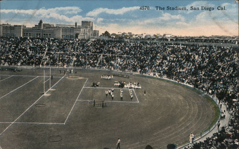 A large crowd watches an event, possibly a marching band performance, on a football field surrounded by a running track. Buildings are visible in the background beyond the stadium stands.