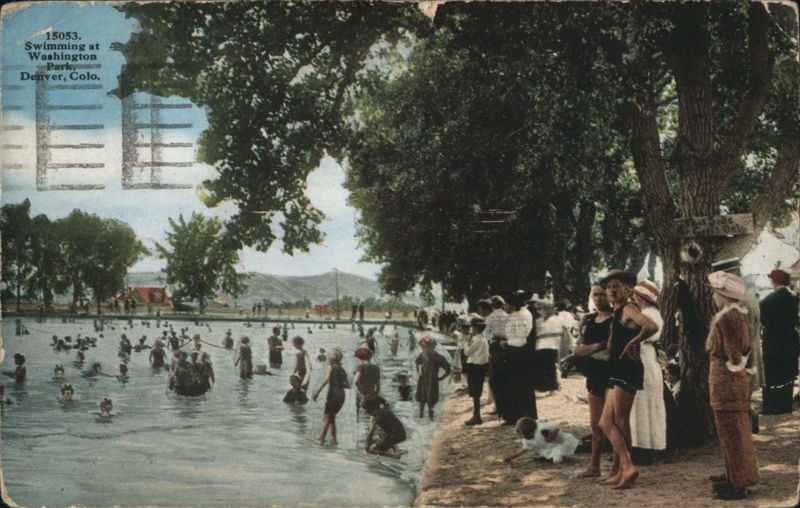 A large group of people are swimming and enjoying a sunny day at a man-made beach in Washington Park. Spectators, some formally dressed, watch from the sandy shore under large trees.