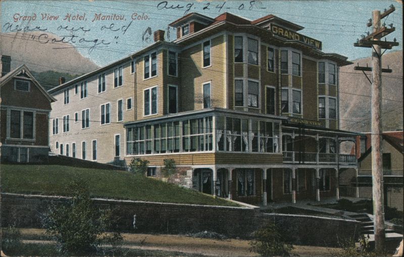Exterior view of the hotel on a hillside, with a large enclosed sun porch across the front. A smaller cottage is visible to the left. A handwritten note on the front reads "Near our old 'Cottage'".