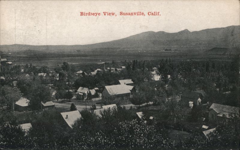 An elevated view of the town of Susanville, showing houses nestled amongst trees with mountains in the distance.