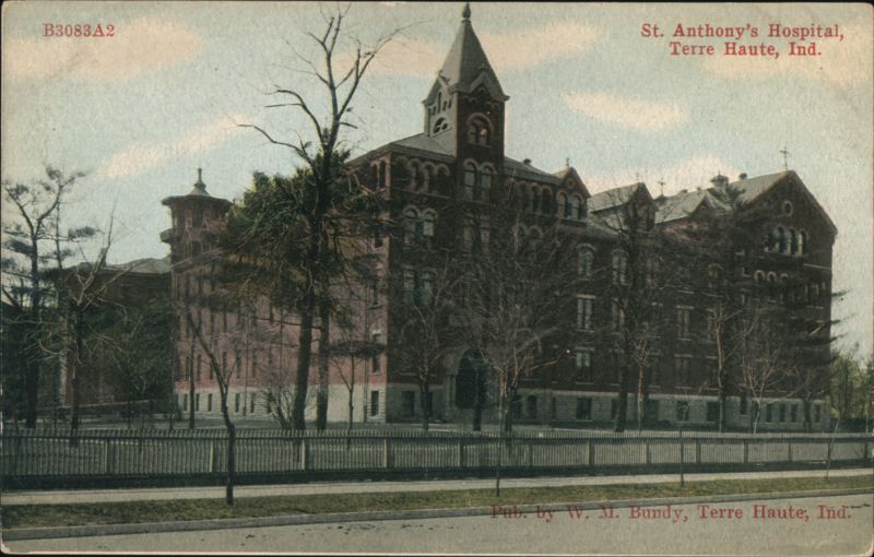 View of the multi-story brick St. Anthony's Hospital building. It features a prominent steeple and is surrounded by bare trees behind a fence.