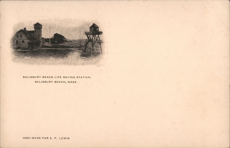 A view of the Salisbury Beach Life Saving Station and an adjacent wooden lookout tower on the coast.