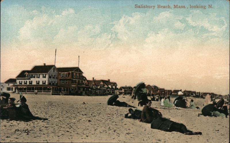 People relax on a sandy beach, some under umbrellas. In the background are large, multi-story wooden buildings lining the shore under a partly cloudy sky.