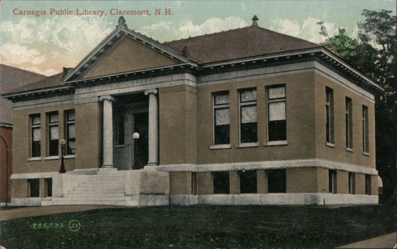 A view of the two-story brick Carnegie Public Library building, designed in the Classical Revival style. It features a prominent gabled portico entrance with two large Ionic columns.