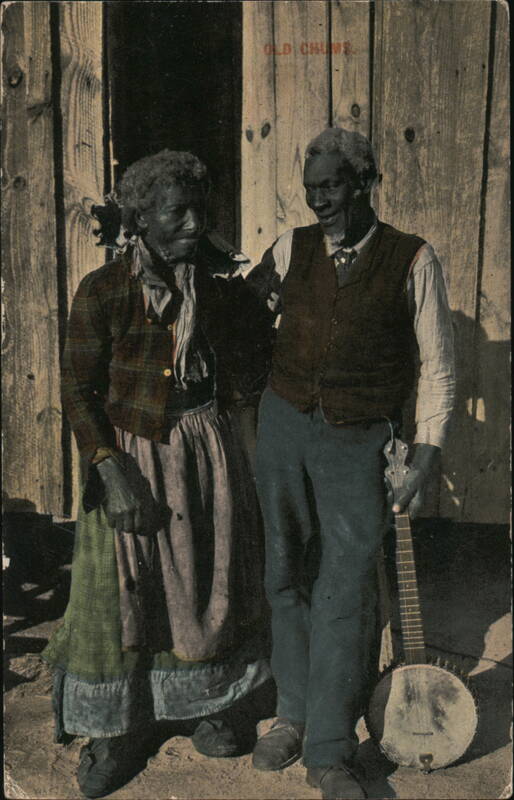 | An elderly African American couple, referred to as 'Old Chums' on the card, are pictured standing side-by-side. The man, smiling, has his arm around the woman's shoulder and is holding a five-string banjo. The woman is also smiling and looking at the man. They are standing outdoors in front of a vertical wood-planked wall. |