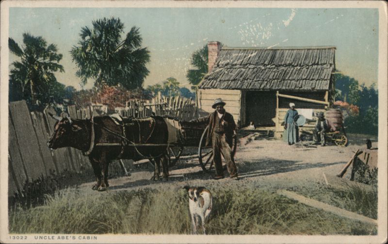 A man identified as 'Uncle Abe' stands next to an ox-drawn cart in front of a rustic wooden cabin with a thatched roof and brick chimney. A woman and child are visible near the cabin entrance, and a dog stands in the foreground. Palm trees are prominent in the background, suggesting a southern setting. |