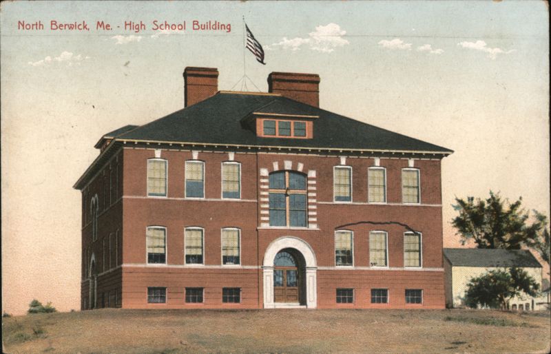 A two-story red brick schoolhouse with a hip roof, two chimneys, and an American flag. The building features white window trim, an arched central entrance, and a prominent arched window on the second floor.
