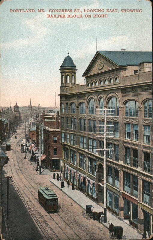A view looking east down a bustling Congress Street, with an electric trolley on its tracks, a horse-drawn carriage, and pedestrians on the sidewalks. The prominent Baxter Block building is on the right, decorated with American flags.