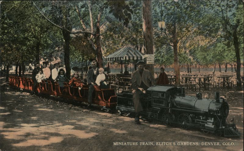 A miniature steam train with an engineer and several open-air cars filled with passengers, including men, women, and children, travels through a wooded park area.