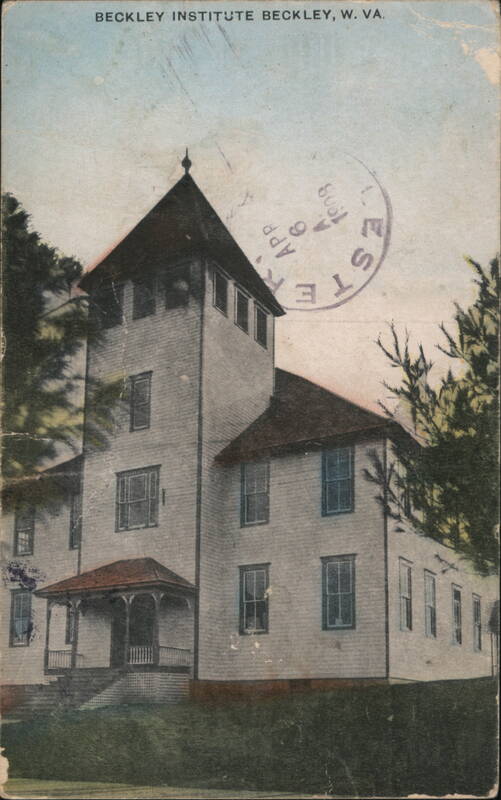 A multi-story white wooden building with a prominent square tower and dark roofs. The building is situated on a grassy hill surrounded by trees.