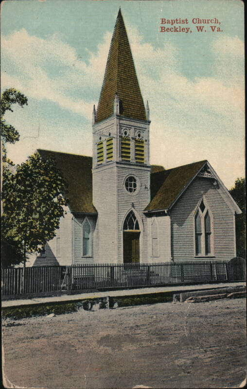 A white wooden church with a prominent steeple and Gothic architectural elements, including pointed arch windows and a rose window. A dark wooden picket fence runs along the front of the property next to a dirt road.