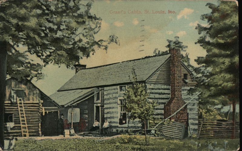 A view of a large log cabin with a prominent brick chimney on the side. An attached, smaller log structure is on the left with a ladder leaning against it. Several people are visible outside the cabin, including two sitting on a bench.
