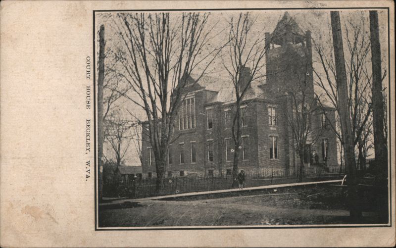| A large, multi-story brick courthouse with a prominent corner tower, viewed from a slight elevation. The building is surrounded by a fence and numerous bare trees, suggesting a winter or late autumn scene. A person is visible walking on the sidewalk in front of the building. |