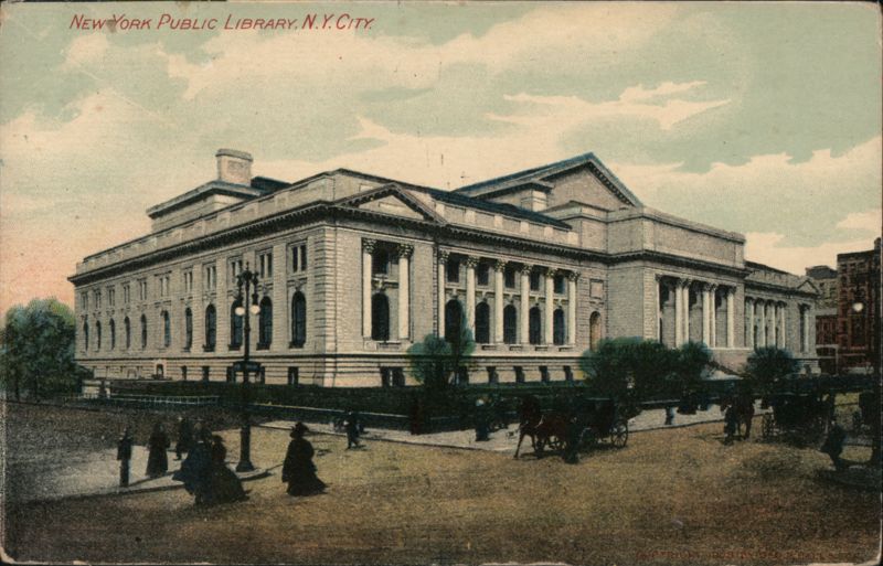 An exterior view of the New York Public Library from a street corner. Pedestrians in period clothing and a horse-drawn carriage are visible in the foreground.