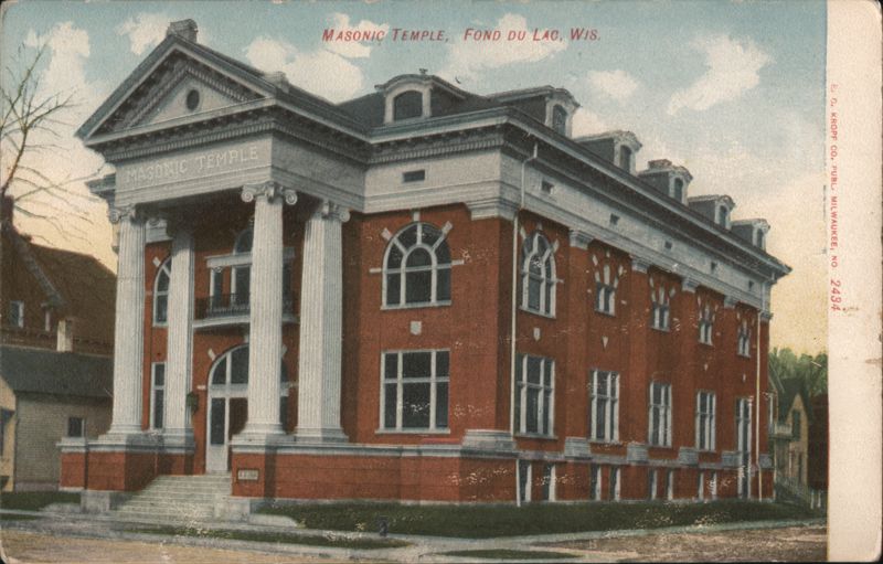 A Neoclassical red brick building featuring a large portico with four Ionic columns supporting a pediment. The building has arched windows on the second floor and a dark roof with dormer windows.