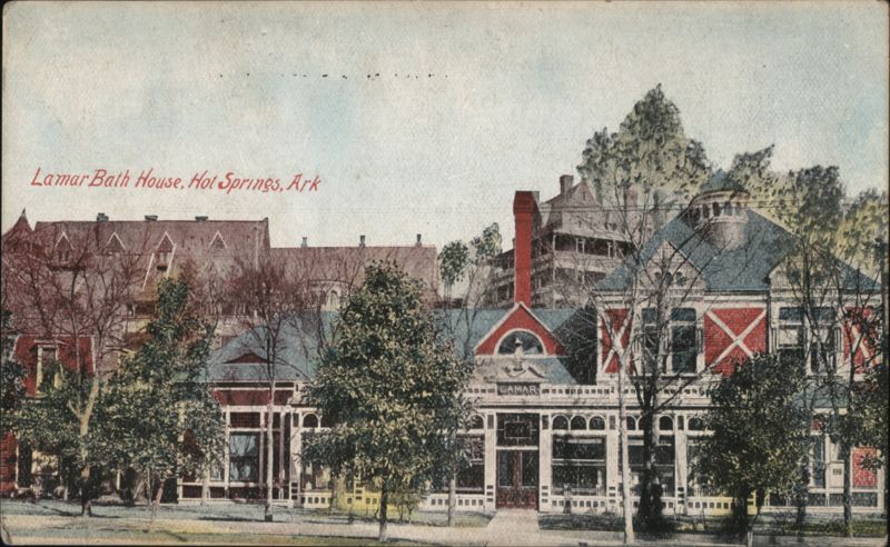 Exterior view of the Lamar Bath House, a long building with multiple gables, large windows, and a covered porch. Trees are in the foreground, with other buildings visible on a hill behind the bathhouse.