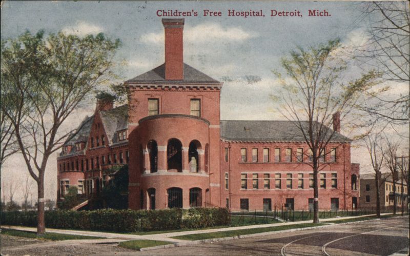 | A view of the large, red brick Children's Free Hospital. The building features a prominent central chimney tower and a two-story rounded section with large arches. The hospital is situated on a corner lot with a sidewalk, street, and what appear to be trolley tracks. |