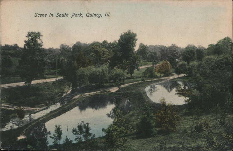 A view of a park featuring several man-made ponds surrounded by grassy banks, trees, and winding pathways.