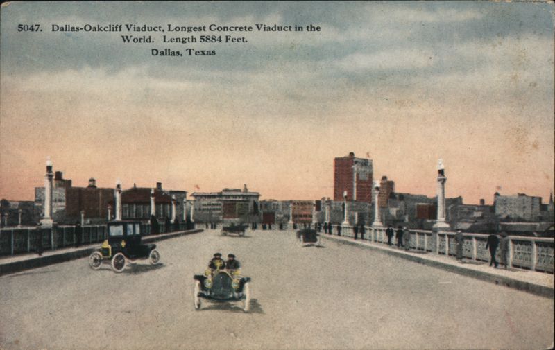 View of the Dallas-Oakcliff Viaduct, with a stated length of 5884 feet. Early automobiles and pedestrians are on the bridge with the Dallas skyline in the background.