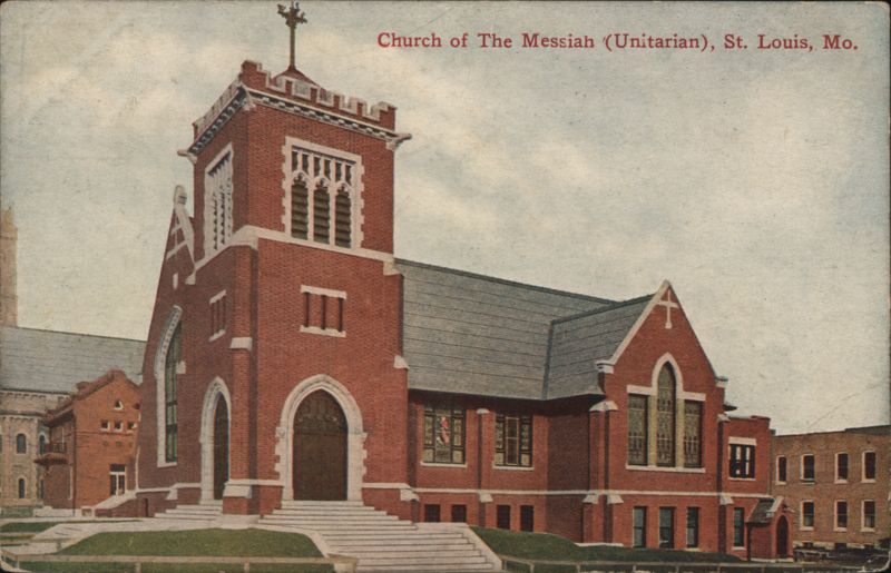 Exterior view of the red brick, Gothic Revival style Church of the Messiah (Unitarian). The building features a prominent square bell tower with crenellations, pointed arch windows and entryway, and a slate roof.