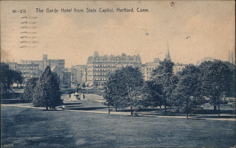 View of the Garde Hotel from the grounds of the Connecticut State Capitol in Hartford. The scene shows a large grassy park area with trees and walkways in the foreground.