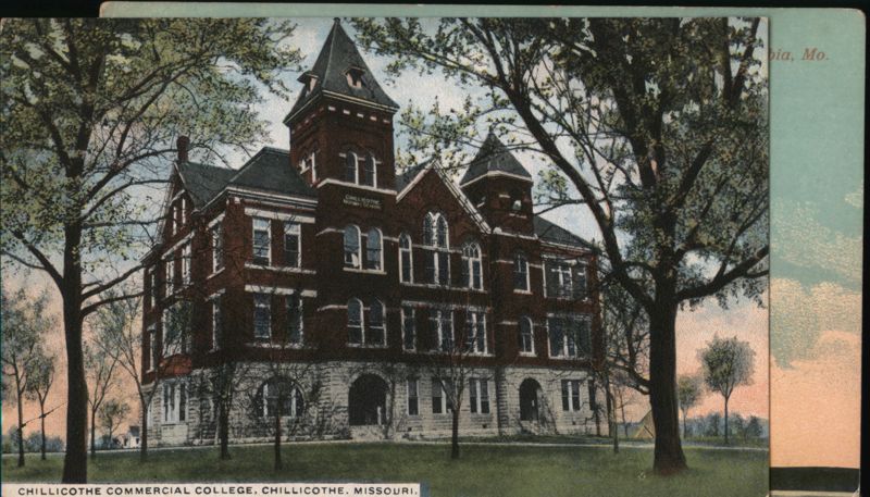 | A colored view of the three-story brick Chillicothe Commercial College, featuring a prominent square tower and a smaller turret on the roofline. The building has a rusticated stone foundation and is set on a lawn amidst large, bare-branched trees. |