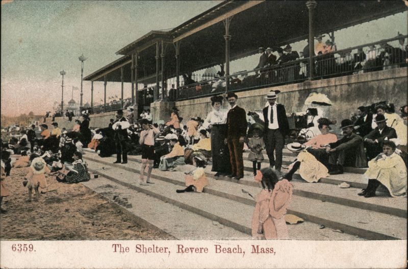 | A large crowd of people in early 20th-century attire are gathered on concrete steps and under a long, covered pavilion overlooking the sand. The spectators, including men, women, and children, are sitting on the steps or standing within the shelter. |