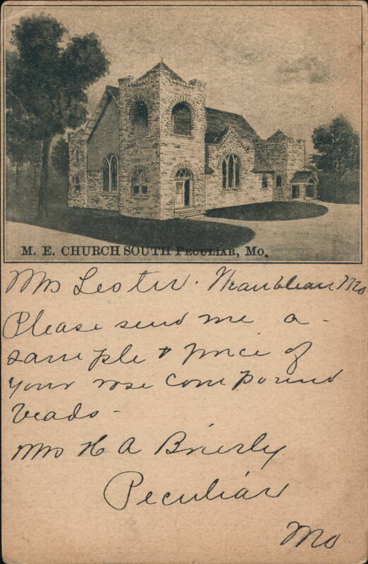 Exterior view of the stone Methodist Episcopal Church South, featuring arched windows and a prominent corner bell tower. A handwritten message from Mrs. H.A. Brierly of Peculiar requests a 'sample & price of your meal compound' from Mrs. Lester Nanbleau. The card is postmarked March 23, 1913.