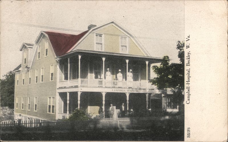 Exterior view of the Campbell Hospital, a two-story clapboard building with a red-tinted roof. Several people in uniforms, likely nurses, stand on the upper porch, while two men stand on the lower porch.