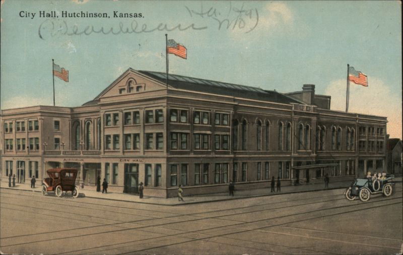 Street corner view of the Hutchinson City Hall and Auditorium building. Early automobiles and pedestrians are visible on the streets. Three American flags are flying from the roof.