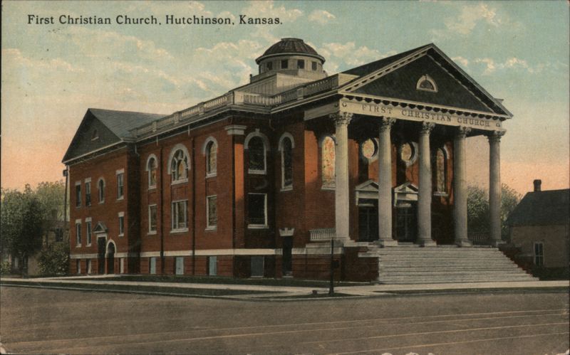 A corner view of the First Christian Church, a red brick Neoclassical building with a large gabled portico supported by four white columns and a central dome on the roof. Several large arched, stained-glass windows are visible.