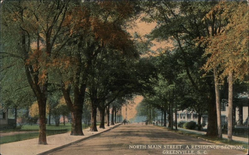 A view down a wide, dirt road lined with mature trees that form a canopy. Houses are visible through the trees on both sides of the street in this residential area. In the distance, several people and a horse-drawn vehicle can be seen.