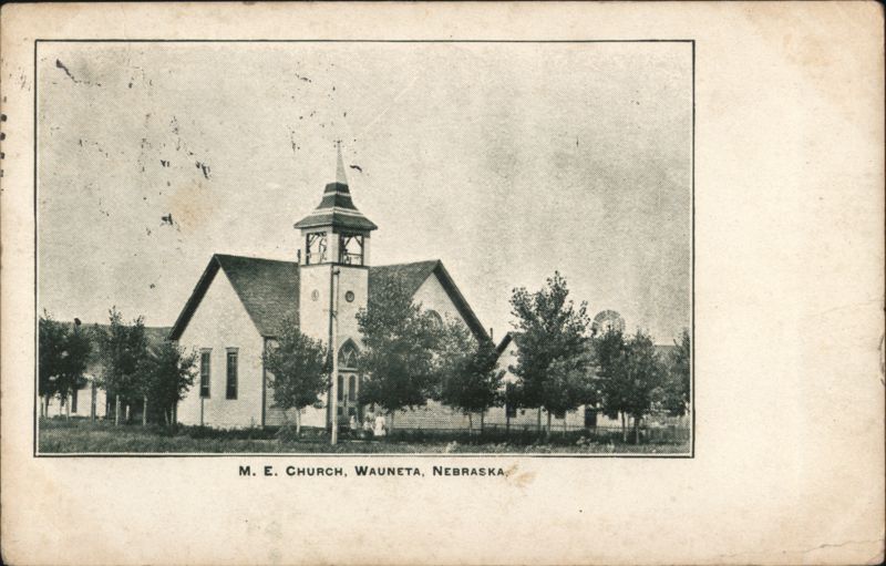 View of the Methodist Episcopal Church, a white wooden building with a square bell tower and steeple. Several young trees are planted in the yard around the church.