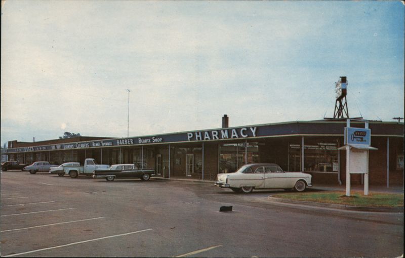 A street-level view of a mid-century strip mall with several classic American cars parked in the front lot. Visible signs for businesses include Pharmacy, Barber Shop, Beauty Shop, The Spot, Lowney's, Lilien's, and Renny's. A sign for Quinn's is on the right. |