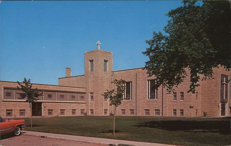 Exterior view of the Grafton Lutheran Church, a mid-century modern brick building with a central tower topped with a cross. The church was founded in 1878. A vintage red car is partially visible on the left.