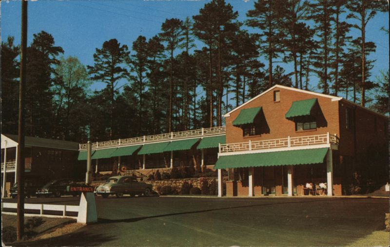 | Exterior view of the Beaver Lake Court, a brick motel with green awnings and white railings. Vintage cars are parked in the lot in front of the building, with a forest of tall pine trees in the background. Amenities listed on the back include radiant heat, room telephones, T.V. rooms, and an all-tile bath. |