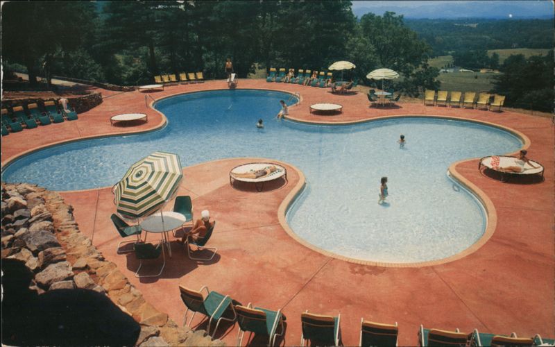 The swimming pool with heated spring water which overlooks golf links and an inspiring vista of mountain scenery and lofty peaks in the distance including Mt. Pisgah. Guests are seen swimming and lounging around the uniquely shaped pool.