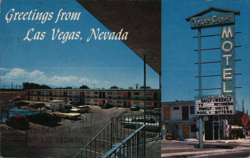 View of the two-story Vegas Chalet Motel building, swimming pool, and parking lot. A large roadside sign advertises amenities including vacancy, daily/weekly rates, TV, kitchens, family units, and a pool.