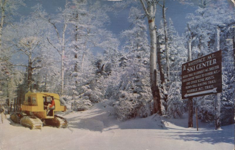 A yellow Sno-Cat transports skiers to the upper level at the entrance to the 4400 Foot Development. A wooden sign points to trails including the access trail to Lookout Mt. Shelter, cross country trails to Esther Mt., the Down Hill Racing Trail, and the Marble Mt. Trail. |