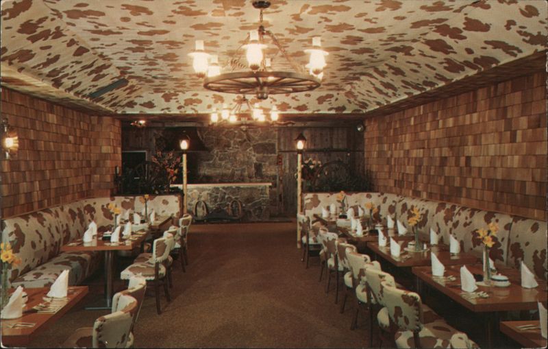 Interior view of a restaurant with distinctive cowhide print wallpaper covering the arched ceiling and booth upholstery. A large wagon wheel chandelier is the central light fixture. The establishment specializes in steaks and chops.