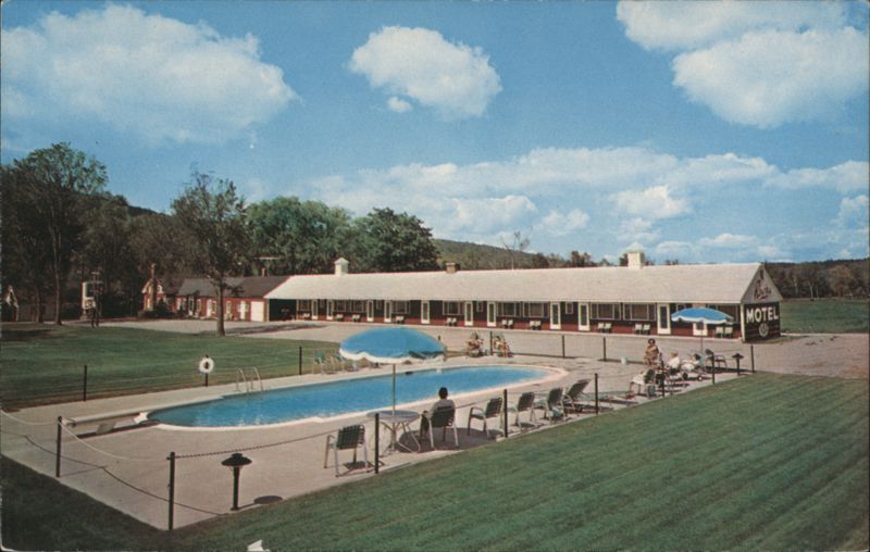 | A new, luxurious motel featuring wall-to-wall carpeting, full tile baths with tub and shower, room controlled heat, cross ventilation, free TV, and a heated swimming pool. Open year 'round. "Franconia Notch and Aerial Tramway Viewed Through Picture Windows". Your Hosts, Helen and Stan Rowins. |