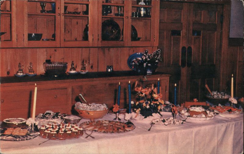 A long table laden with a variety of foods for a buffet supper, including salads, appetizers, and desserts. Tall candles are lit on the table, and a wooden hutch is visible in the background.