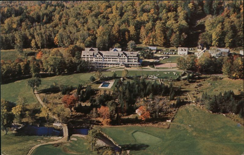 An aerial view of the Eagle Mountain House resort during autumn. The complex includes the main hotel building, a swimming pool, a tennis court, and part of a golf course, all surrounded by colorful fall foliage in the mountains.