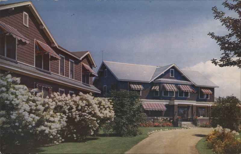 The Spalding Inn in the White Mountains of New Hampshire. The view shows a large inn building with dark shingle siding and striped awnings, set amongst trees with a large flowering bush in the foreground.