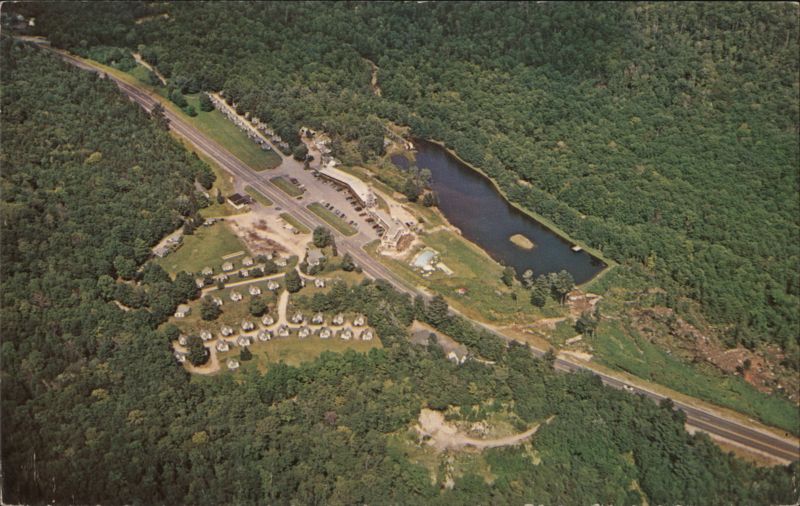 | View shows Indian Head Motel, Tower, Swimming Pool, East English Village and Shadow Lake on right of U.S. Route 3 looking north. In center foreground at left is English Village West. Famous Indian Head Profile towers above the Resort on Pemigewasset Mountain. |