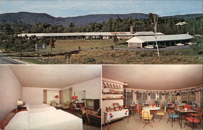 Located in Littleton, N.H., on Route 302 and Interstate 93. This multi-view shows the motel's exterior, a guest room, and a common area. Features included 41 modern units, tile showers, room-controlled heat, TV, telephone, a heated pool, and complimentary continental breakfast. |
