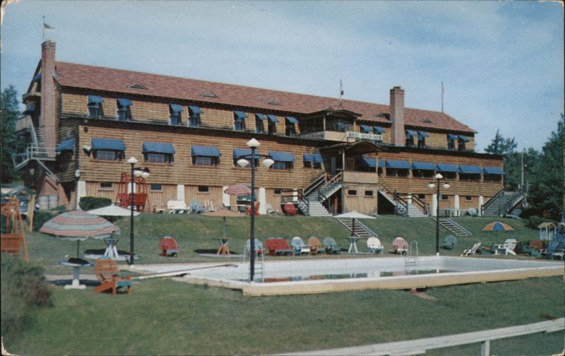A view of the large wooden lodge-style hotel with its distinctive blue awnings and a swimming pool on the front lawn. According to the text, the proprietor was Oscar Henaire, and amenities included a private swimming pool and tennis.