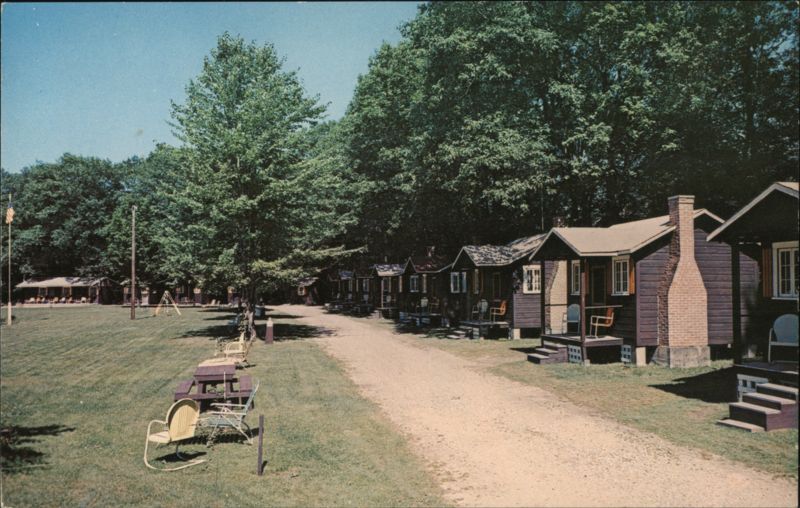 View of the roadside cabins and grounds of the Maple Lodge Motor Court. The establishment advertised modern units with shower, fireplace, and automatic heat, suitable for 2 to 6 persons and open year-round.