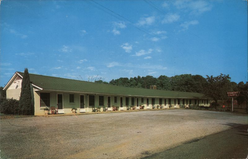 Exterior view of Roanoke Courts, a single-story motel with a gravel parking lot. The postcard advertises New Modern Units, Tub and Shower Combination Baths, Filtered Hot Air Heat, Foam Rubber Mattresses, Air-Conditioned, and Free Room TV. The phone number is 8511. |