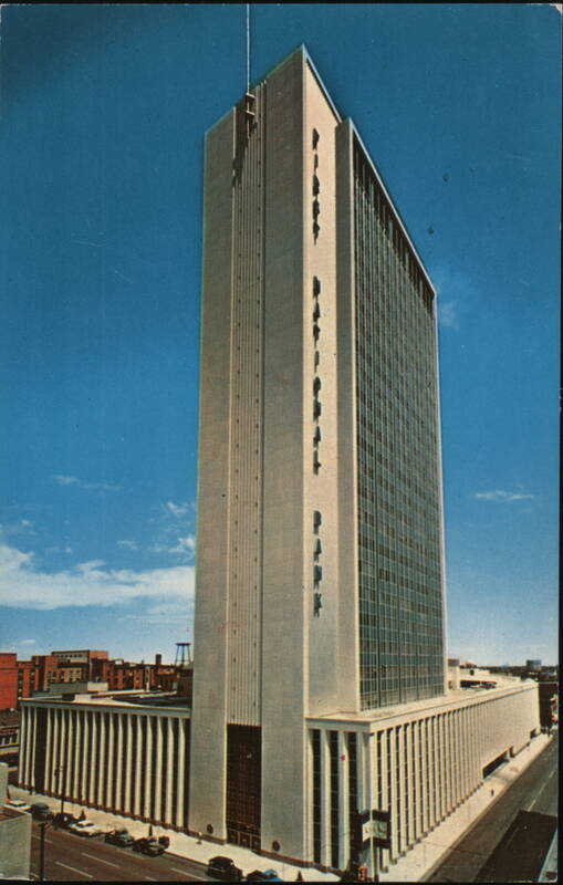 From the Sky Deck of the First National Bank Building skyscraper, highest building in the Rocky Mountain West, may be seen a panorama of nearly 200 miles of the Rocky Mountains, as well as a birdseye view of Denver by day or night. The skyscraper office building is the home of the First National Bank of Denver. |